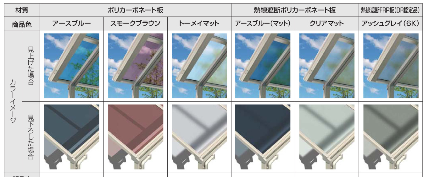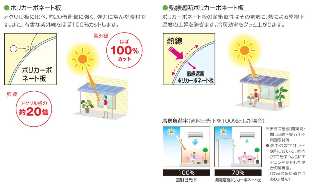 - 屋根材のポリカーボネート板はアクリル板に比べ、約20倍衝撃に強く、晴れの日には紫外線をほぼ100%カット、熱線遮断ポリカーボネートでは熱による屋根下温度の上昇を防ぎます。