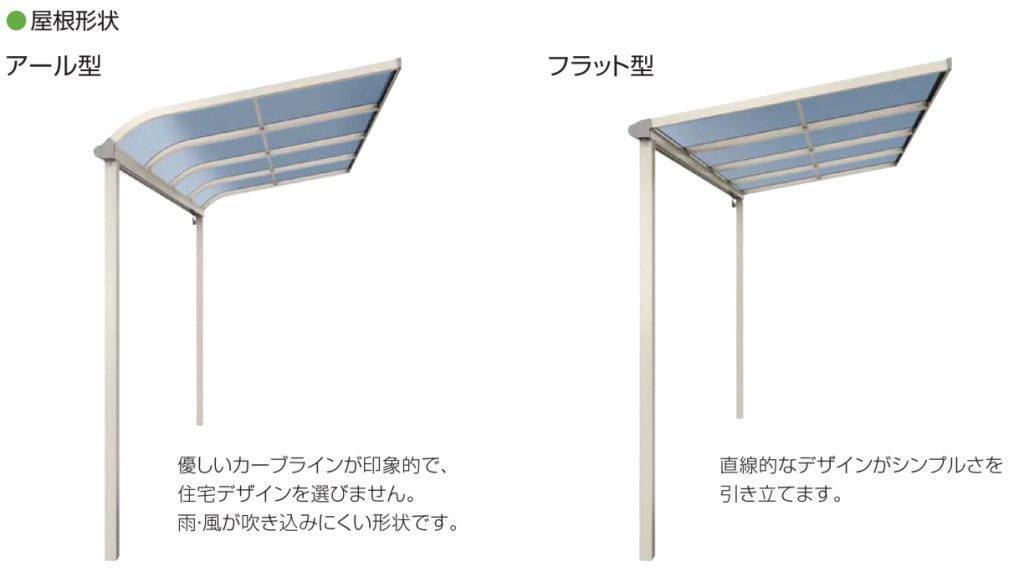 屋根の形状はアール型とフラット型があり、本体・ポリカ色等もお選びいただける商品となっております。